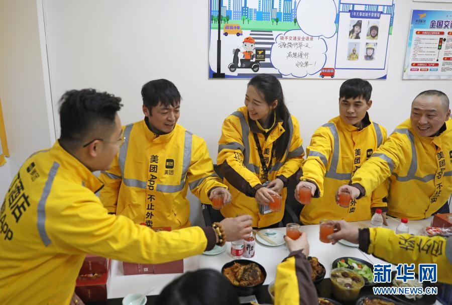2月10日 ,美團專送騎手小月月(中)和同事在配送站點聚餐過年。新華社記者 楊青攝