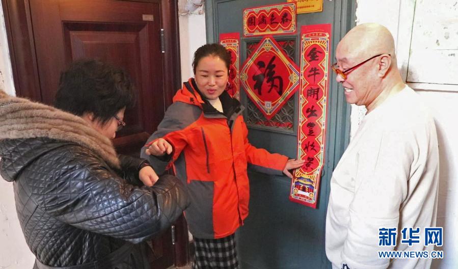 2月10日,社區工作人員為78歲的獨居老人郭東輝貼春聯。新華社記者 趙泳攝