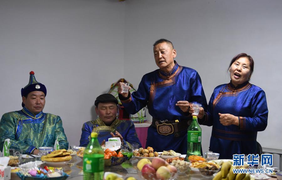在新疆和布克賽爾蒙古自治縣鐵布肯烏散鄉查干阿德爾格村村民哈爾次克家里,前來拜年的親友在唱歌祝福(2月11日攝)。