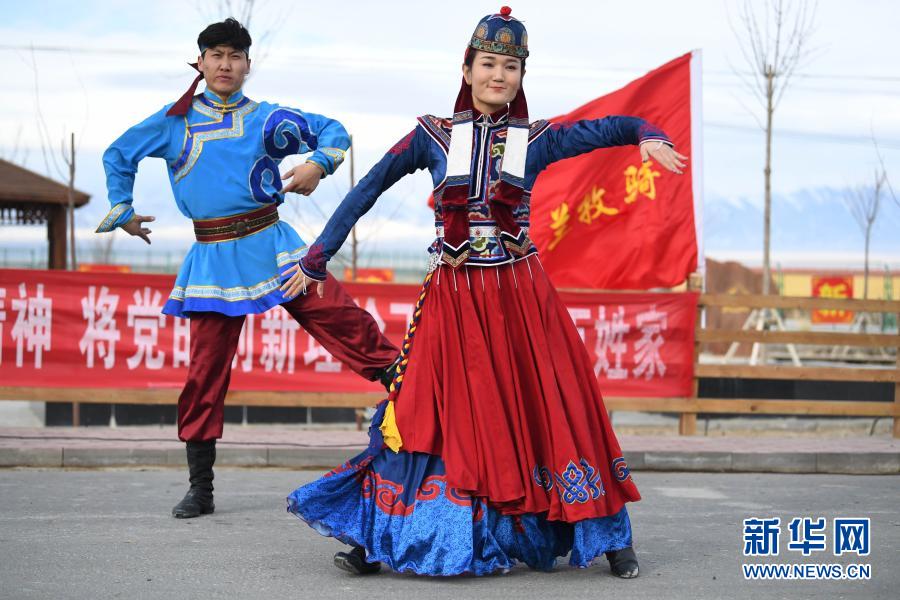 在新疆和布克賽爾蒙古自治縣鐵布肯烏散鄉查干阿德爾格村,烏蘭牧騎演員在表演節目(2月11日攝)。新華社記者 沙達提 攝