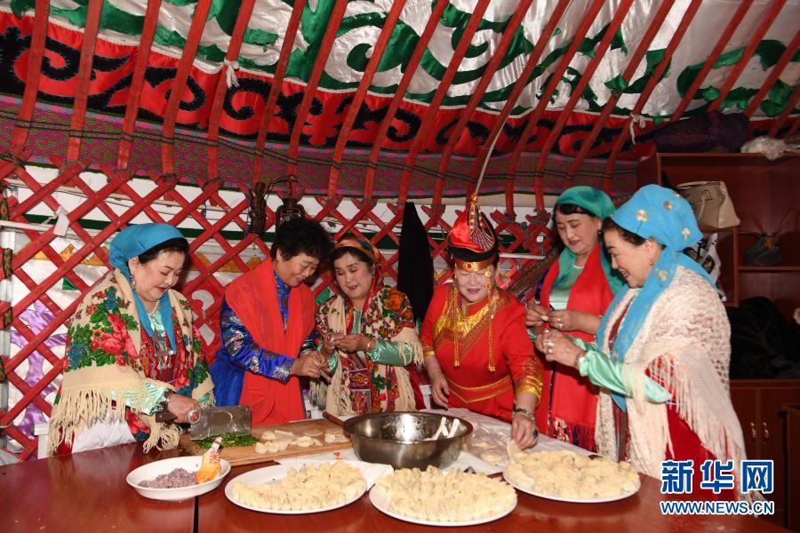 2月14日,在托里縣哈薩克民宿風情自駕游基地的氈房里,民間社團的團員們在包餃子。