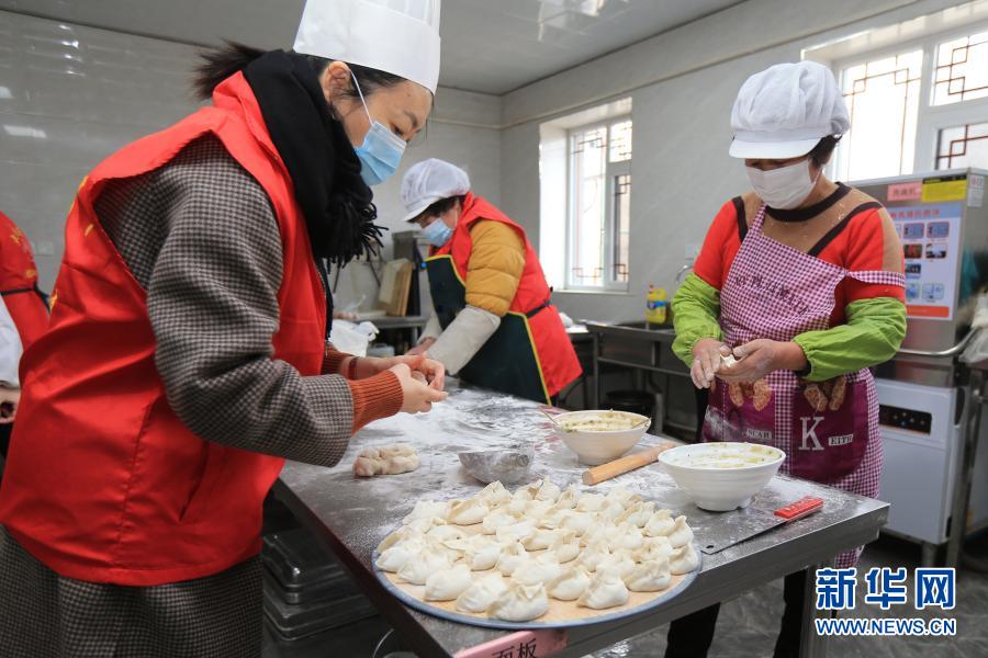 2月12日大年初一,在山東省榮成市斥山街道盛家村的“暖心食堂”,志愿者在為留守老人包餃子。新華社發(王福東 攝)