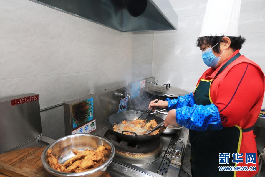 2月12日大年初一,在山東省榮成市斥山街道盛家村的“暖心食堂”,志愿者為留守老人準備午飯。新華社發(王福東 攝)
