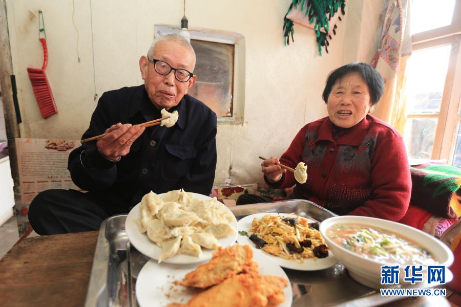 2月12日大年初一,在山東省榮成市斥山街道盛家村,留守老人盛福章、王秀娟(右)老兩口吃上了志愿者送來的午飯。新華社發(王福東 攝)