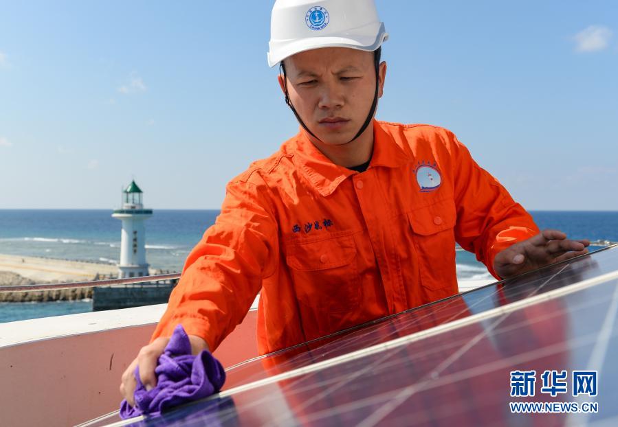 2月13日,在海南省三沙市永興島,傅建斌在燈樁上擦拭太陽能板。新華社記者 周佳誼 攝