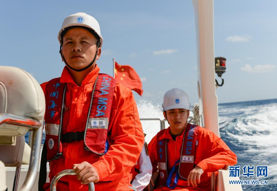 2月14日,傅建斌(左)和同事郭馨陽前往海南省三沙市趙述島巡檢燈樁。新華社記者 周佳誼 攝