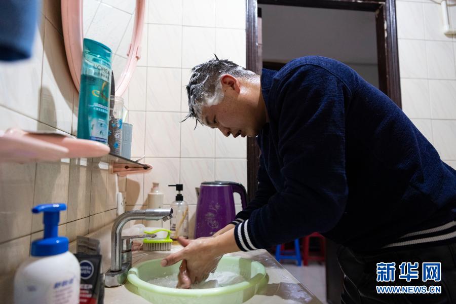2月15日,在哈爾濱市香坊區租住的房子里,劉剛在洗頭。由于頭盔不透氣,一天下來頭上會出很多汗。新華社記者 謝劍飛 攝