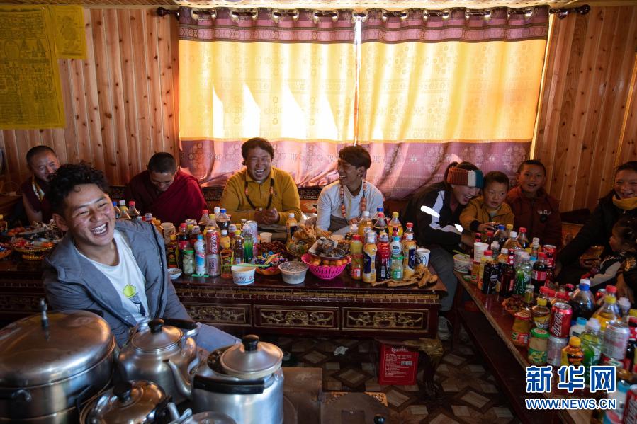 在紅原縣阿木鄉卡口村,親友聚在向巴家,頓炯講的笑話惹得眾人哈哈大笑(2月15日攝)。新華社記者 江宏景 攝