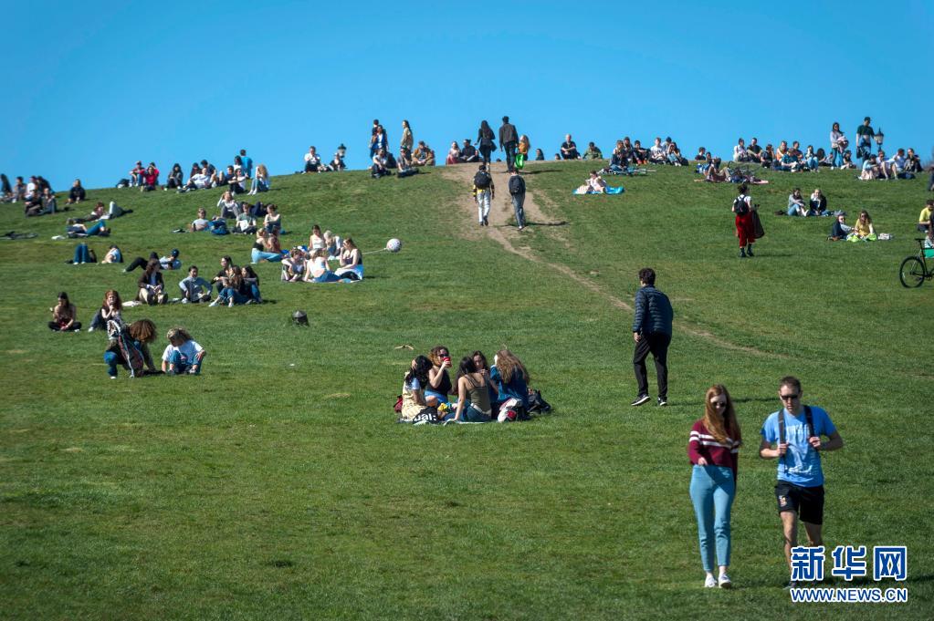 3月29日,人們在英國倫敦的報春花山享受陽光。