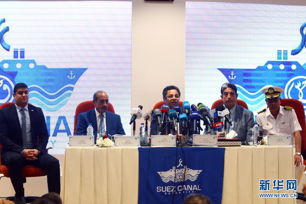 5月30日,在埃及東北部城市伊斯梅利亞,蘇伊士運河管理局就“長賜”號貨輪擱淺事故調查結果召開新聞發布會。