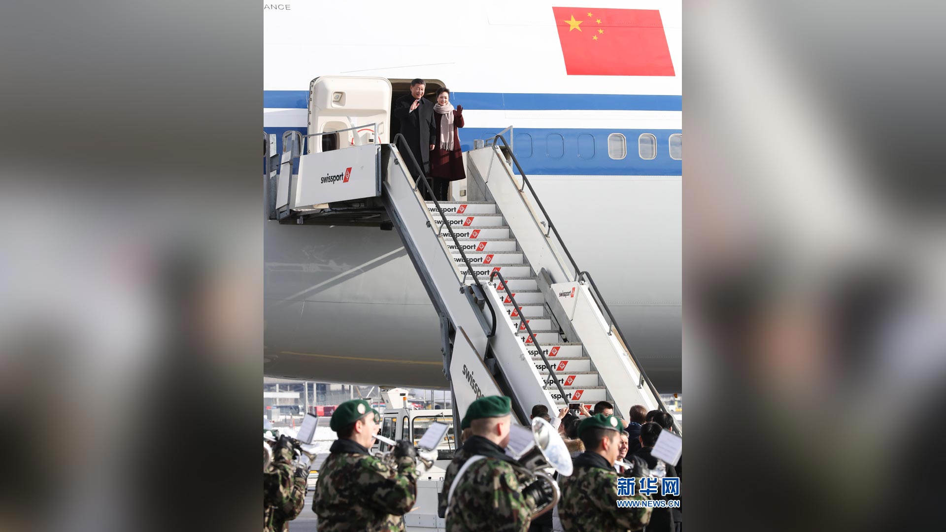 1月15日,國家主席習近平乘專機抵達蘇黎世,開始對瑞士聯邦進行國事訪問。 這是習近平和夫人彭麗媛步出艙門。新華社記者饒愛民攝2017-01-16