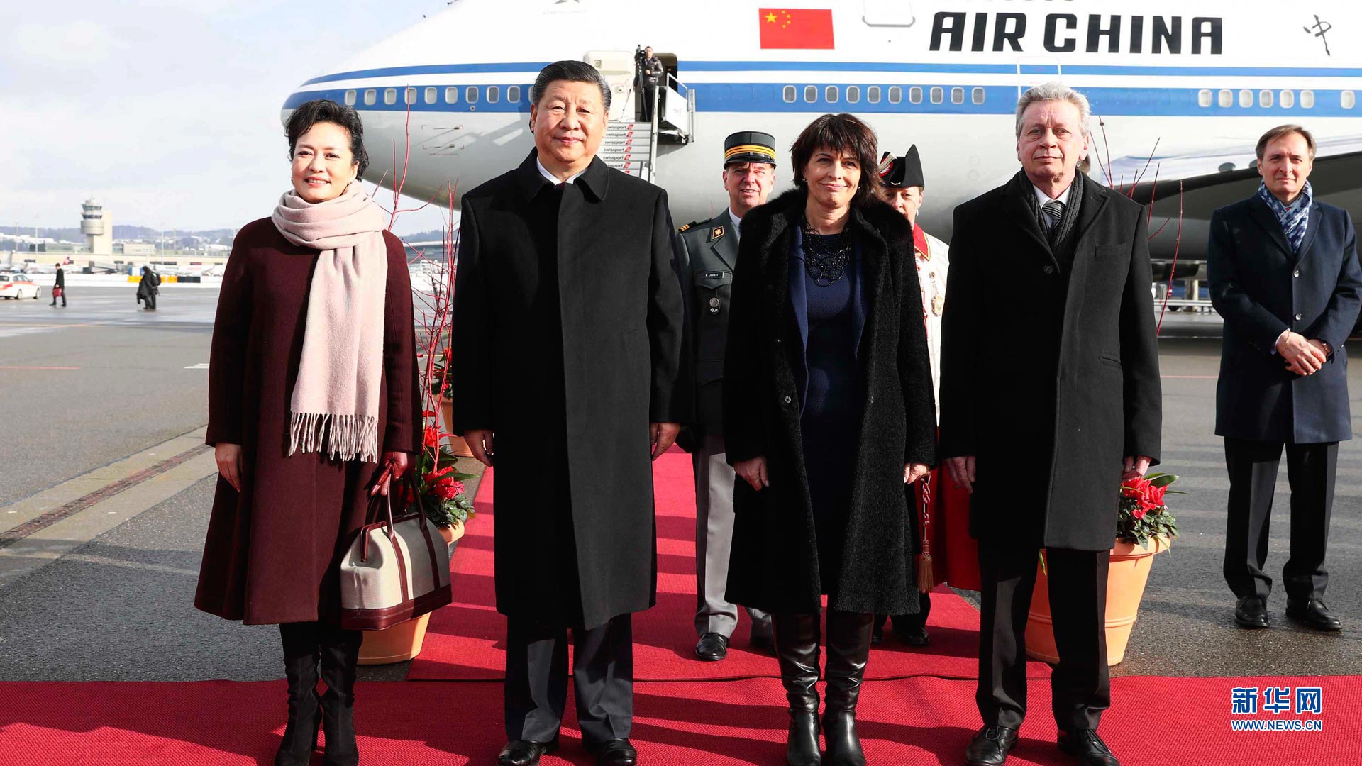 1月15日,國家主席習近平乘專機抵達蘇黎世,開始對瑞士聯邦進行國事訪問。這是瑞士聯邦主席洛伊特哈德在機場為習近平和夫人彭麗媛舉行隆重歡迎儀式。新華社記者蘭紅光攝2017-01-16