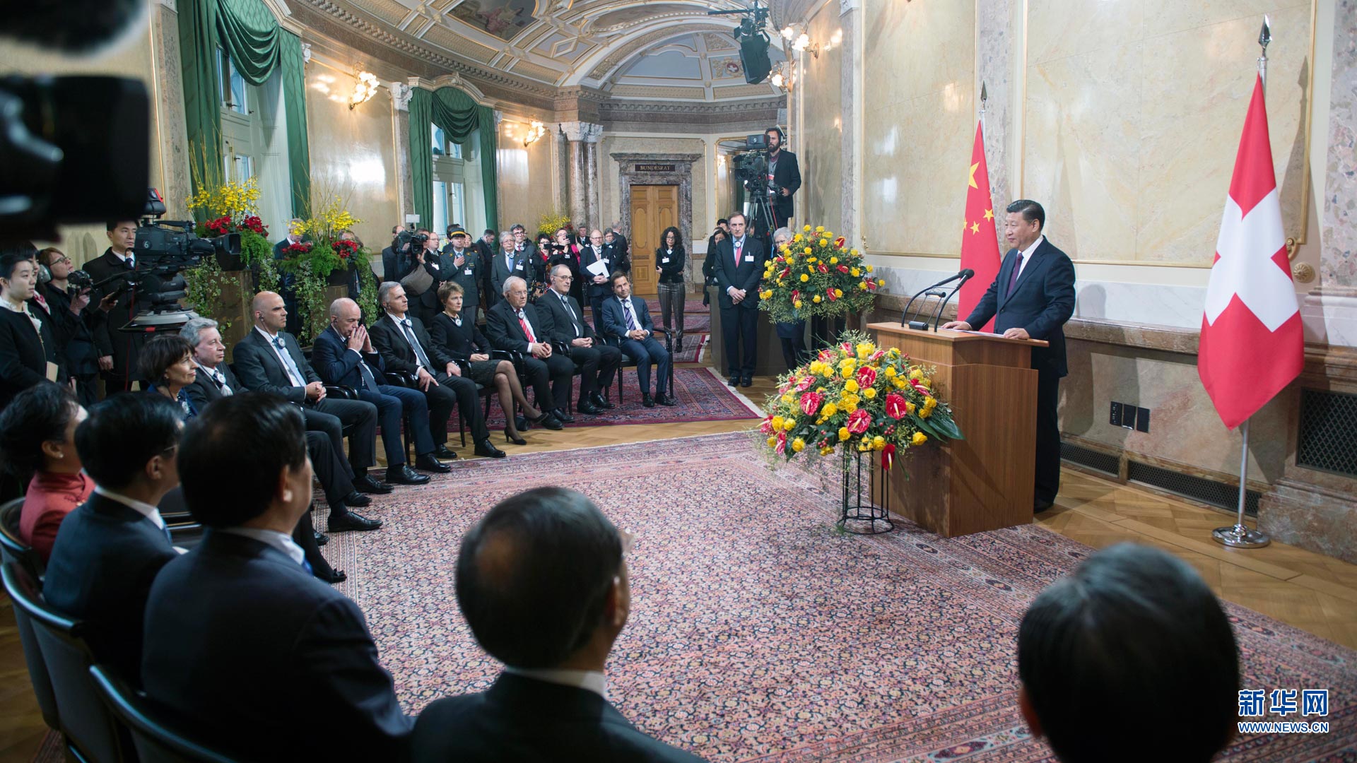 1月15日,國家主席習近平在伯爾尼出席瑞士聯邦委員會全體委員集體舉行的迎接儀式并致辭。 新華社記者謝環馳攝2017-01-16