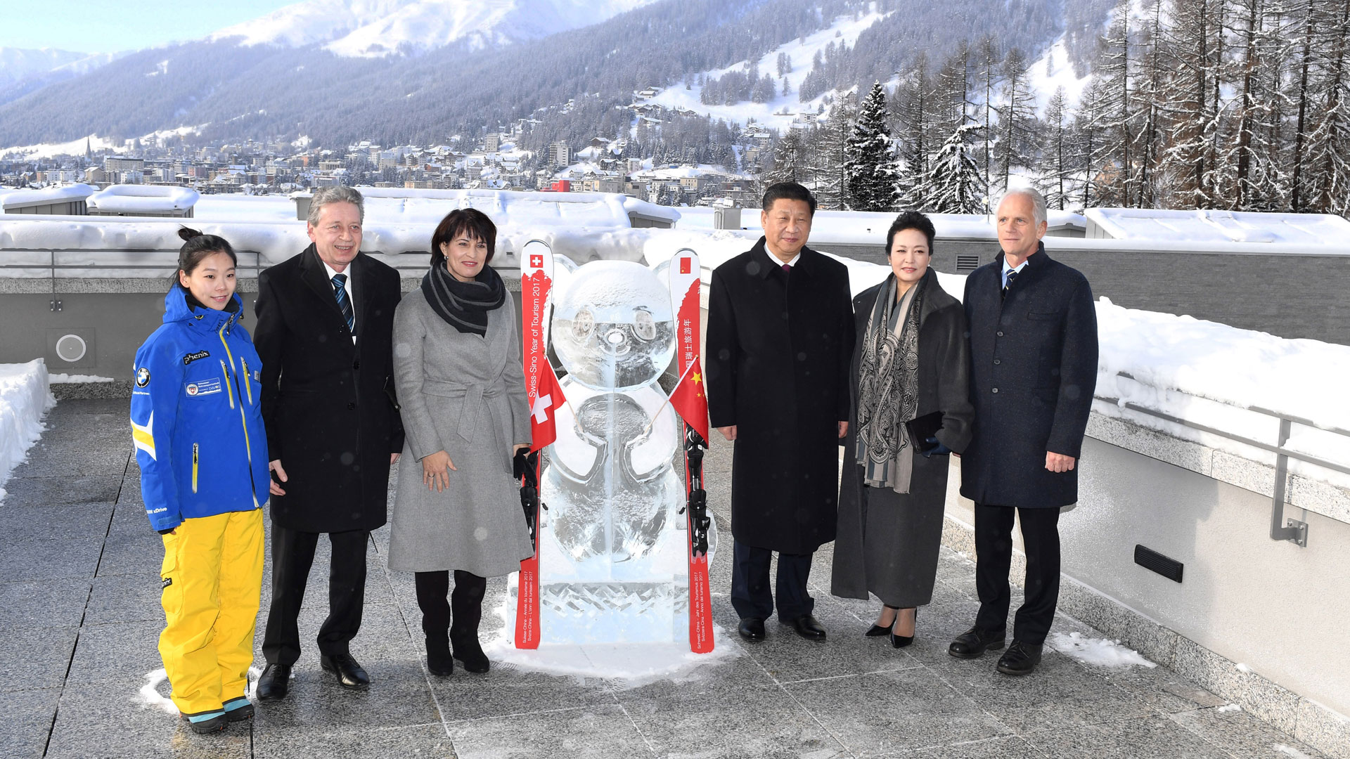 1月17日,國家主席習近平同瑞士聯邦主席洛伊特哈德在達沃斯共同啟動中瑞旅游年。兩國元首夫婦等在熊貓冰雕像和印有中瑞兩國國旗及“中瑞旅游年”字樣的滑雪板旁合影留念。新華社記者 饒愛民 攝2017-01-18