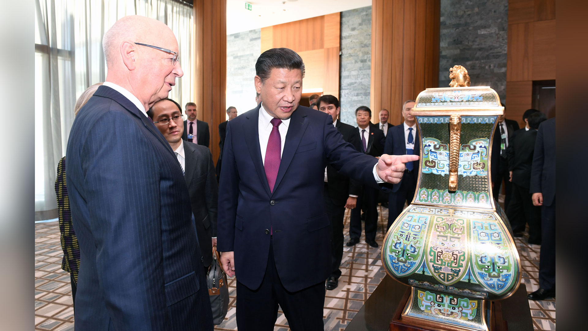 1月17日,國家主席習近平在瑞士達沃斯會見世界經濟論壇主席施瓦布。這是習近平向施瓦布介紹中華人民共和國贈送給世界經濟論壇的四面方尊。新華社記者 饒愛民 攝2017-01-18