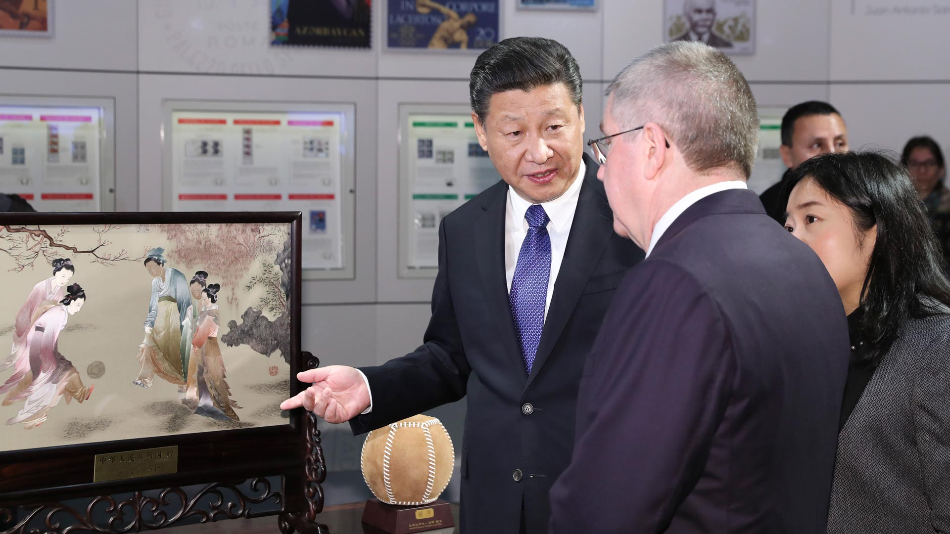 1月18日,國家主席習近平在瑞士洛桑國際奧林匹克博物館會見國際奧林匹克委員會主席巴赫。這是習近平向巴赫介紹中華人民共和國贈送給國際奧林匹克委員會的蘇繡《仕女蹴鞠圖》。新華社記者 丁林 攝2017-01-19