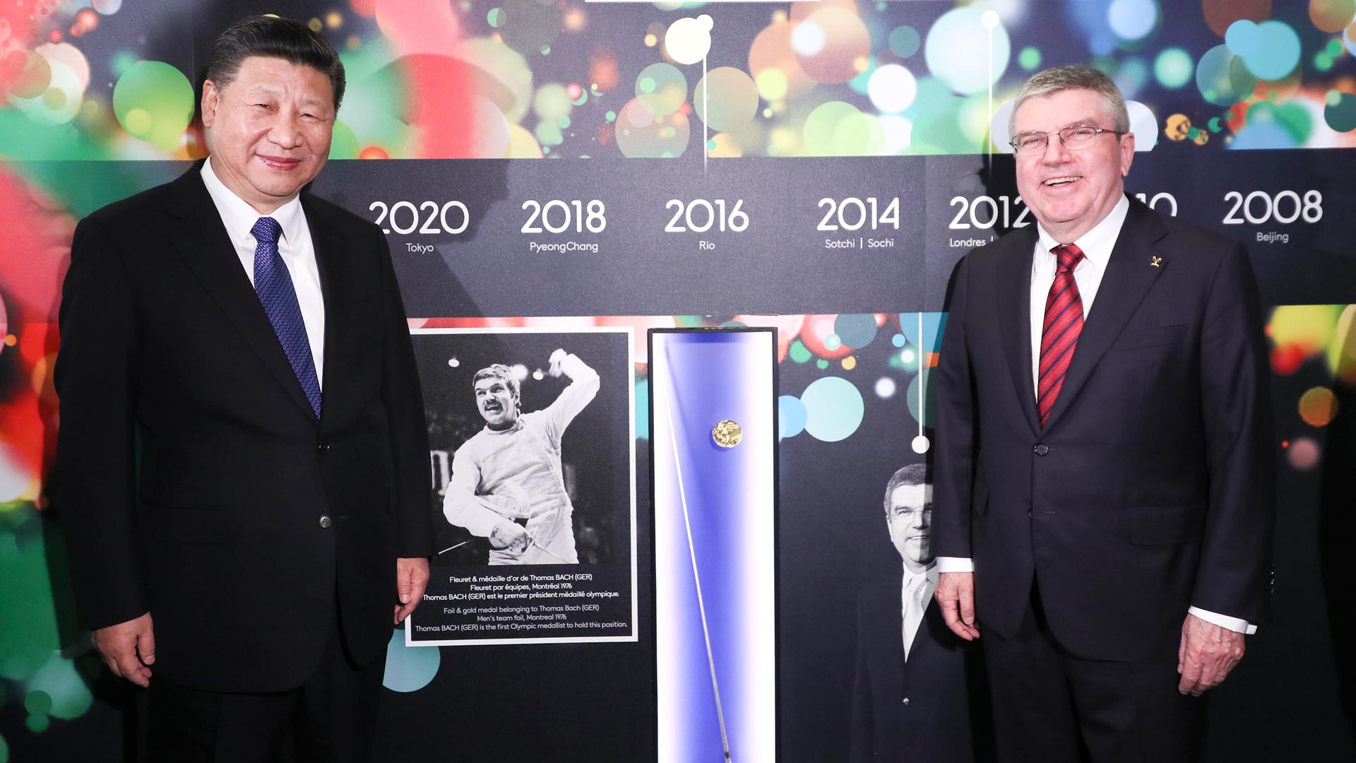 1月18日,國家主席習近平在瑞士洛桑國際奧林匹克博物館會見國際奧林匹克委員會主席巴赫。這是習近平與巴赫在巴赫作為擊劍運動員參加奧運會的照片前合影。新華社記者 蘭紅光 攝2017-01-19