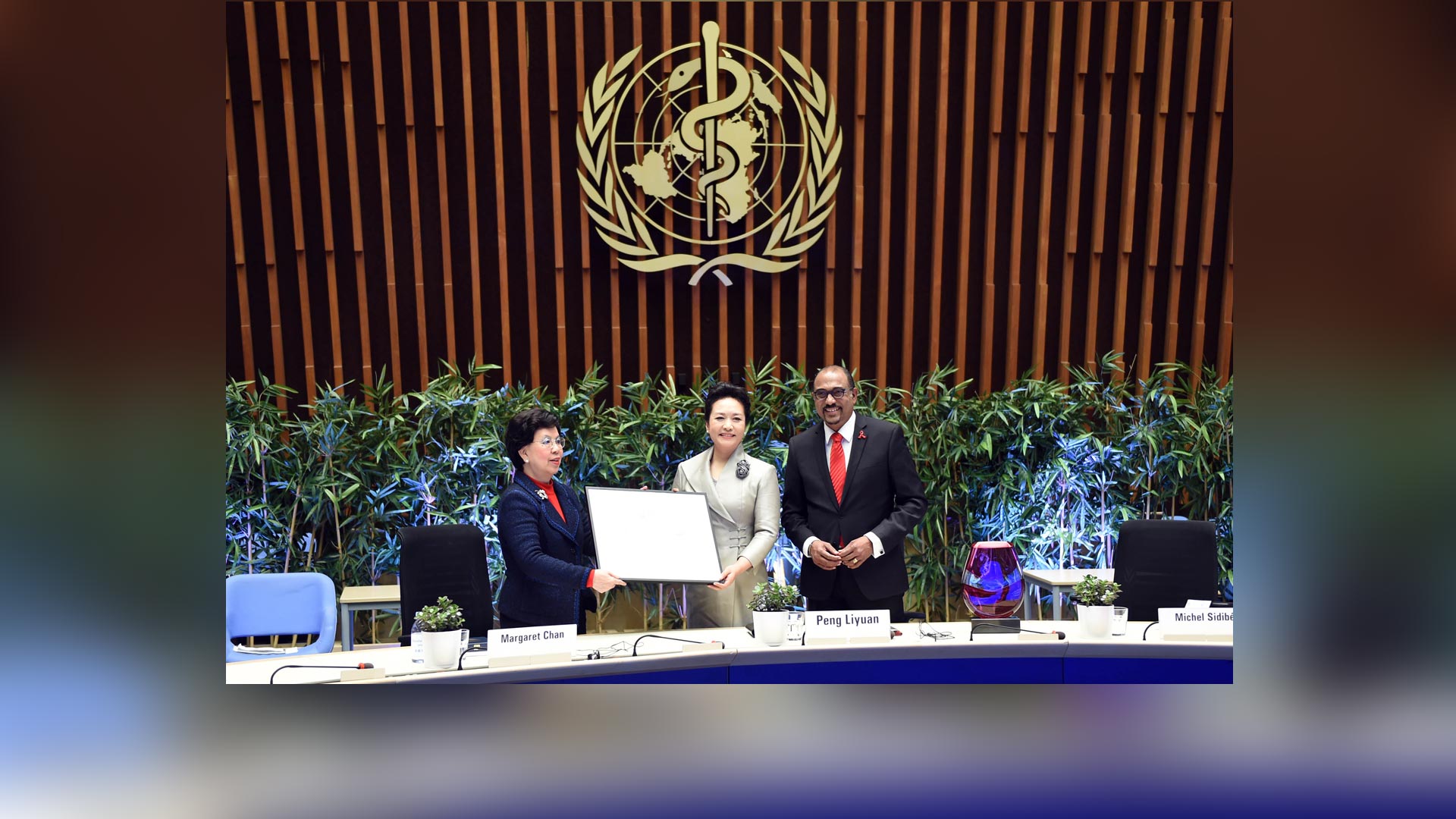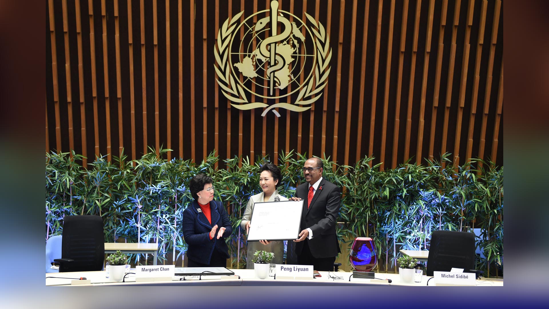 1月18日,國家主席習近平夫人、世界衛生組織結核病和艾滋病防治親善大使彭麗媛應世界衛生組織總干事陳馮富珍和聯合國艾滋病規劃署執行主任西迪貝邀請,在瑞士日內瓦出席為她舉行的親善大使任期續延暨頒獎儀式。這是世界衛生組織總干事陳馮富珍向彭麗媛頒發親善大使任期續延證書。新華社記者謝環馳攝2017-01-19