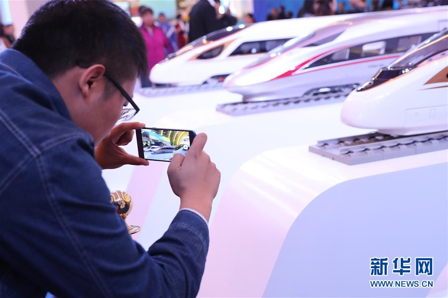 新華社照片,北京,2017年10月12日 向著夢想,奮進!——來自“砥礪奮進的五年”大型成就展現場的報道 10月12日,一名觀眾在“砥礪奮進的五年”大型成就展現場拍攝“復興號”列車模型。新華社記者 張玉薇 攝