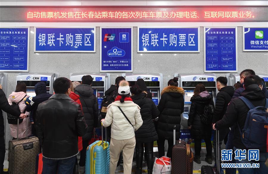 1月3日,旅客在長春火車站售票大廳自動售票機前排隊購票、取票。當日,2018年春運首日火車票在網絡、電話平臺開售。2018年春運從2月1日起至3月12日止,網絡、電話訂票預售期為30天,車站窗口、代售點和自動售票機預售期為28天。新華社記者 張楠 攝