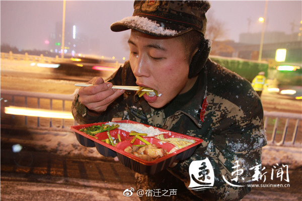 官兵們在暴雪中緊急就餐