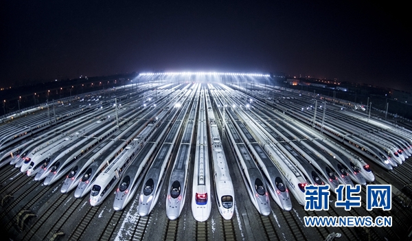 2018年2月1日凌晨,動車組??吭谖錆h動車段的存車線上,準備進行檢修和保溫作業。新華社記者 肖藝九 攝