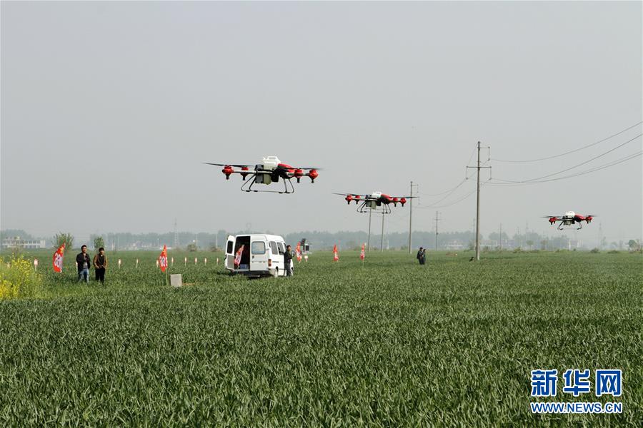 4月17日,在安徽省亳州市蒙城縣香山村,工作人員操作無人植保飛機在田間開展噴防作業。眼下,各地農民搶抓農時開展春耕作業,田野上到處可見繁忙勞作的身影。 新華社發(胡衛國 攝)