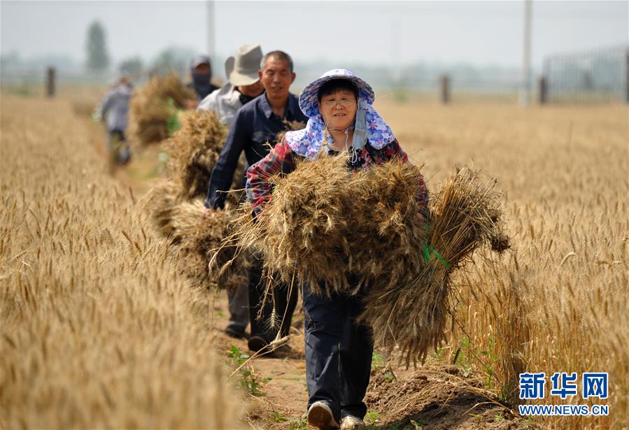 6月12日,中科院南皮生態農業試驗站工作人員陳素英(前)在收集試驗田內的小麥準備測產。眼下正值“渤海糧倉科技示范工程”核心示范區小麥收獲時節,在位于河北省南皮縣的中科院南皮生態農業試驗站,工作人員搶抓農時對不同小麥品種試驗小區進行采樣、測產,確保項目預定目標如期完成。