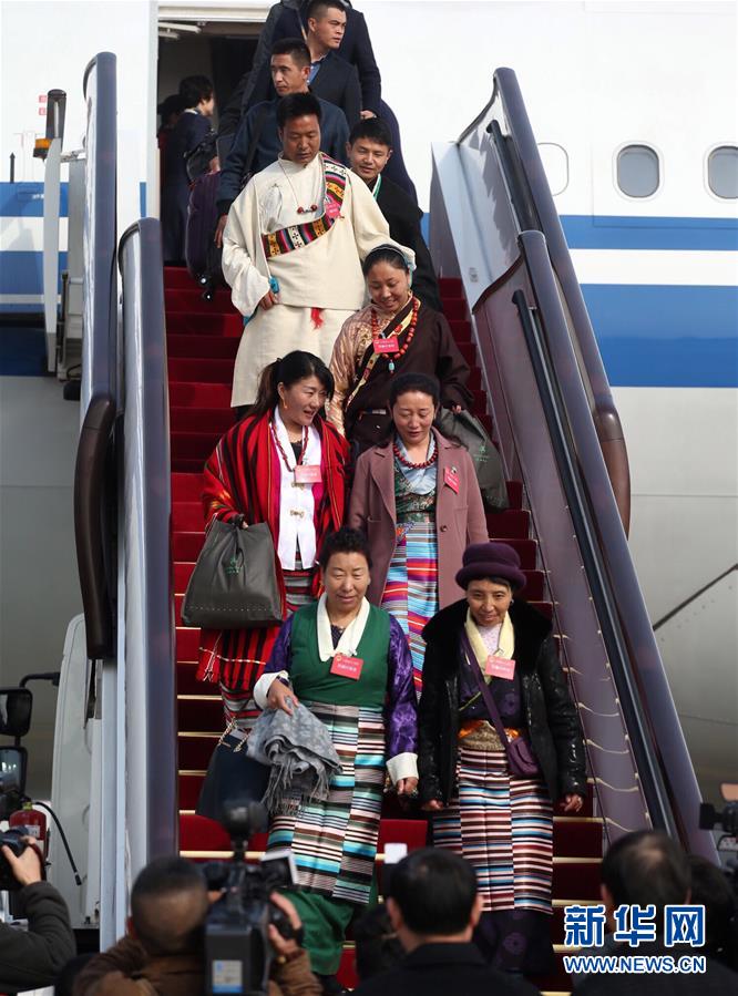 3月2日,出席十三屆全國人大一次會議的西藏代表團乘坐飛機抵達北京。