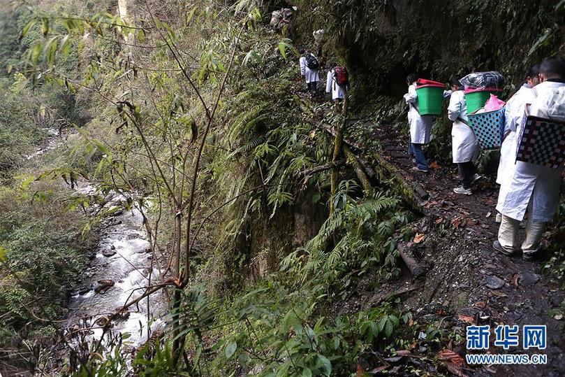 在云南怒江貢山縣丙中洛鎮,醫療隊員在山間道路上前行(1月12日攝)。 新華社記者張加揚 攝