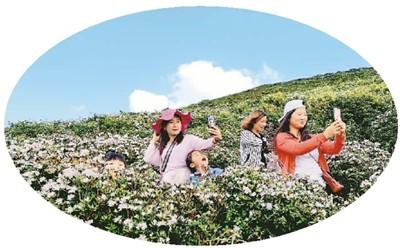 4月6日,在貴州六盤水盤州市烏蒙大草原景區,游客在花海中自拍。劉佳躍攝(新華社發)