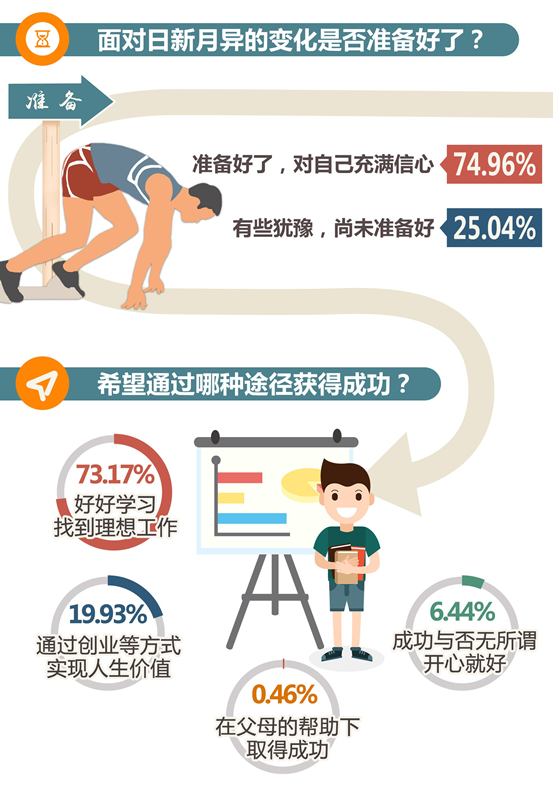 大學生的自信還體現在希望通過努力獲得成功。93.1%的受訪者希望“好好學習,從事理想工作”“通過創新、創業等方式實現人生價值”。在采訪中,不少大學生表示“只要有想法就敢去做”“相信未來有無限可能”。中國地質大學(北京)信息工程學院兼職輔導員王洪宇說,現在的大學生不拘泥于傳統,更愿意參與創新創業,他們甚至會自己創立新工種,把青年特質發揮到極致。分析認為,這一代大學生成長在國家快速發展、改革開放不斷深化、國際地位不斷上升、互聯網與生活緊密融合的時代,他們的成長環境更加優越,視野更加開闊,這對他們的自我認知及性格形成有很大影響,他們更加自信。