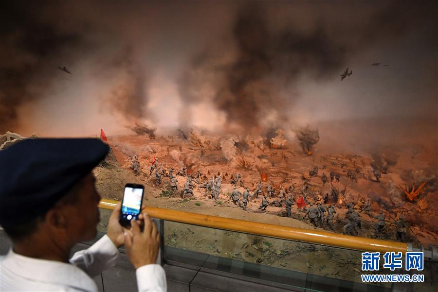 8月18日,在甘肅省會寧縣紅軍長征勝利紀念館,參觀者在觀看大墩梁阻擊戰的模擬場景。? 新華社記者 馬寧 攝