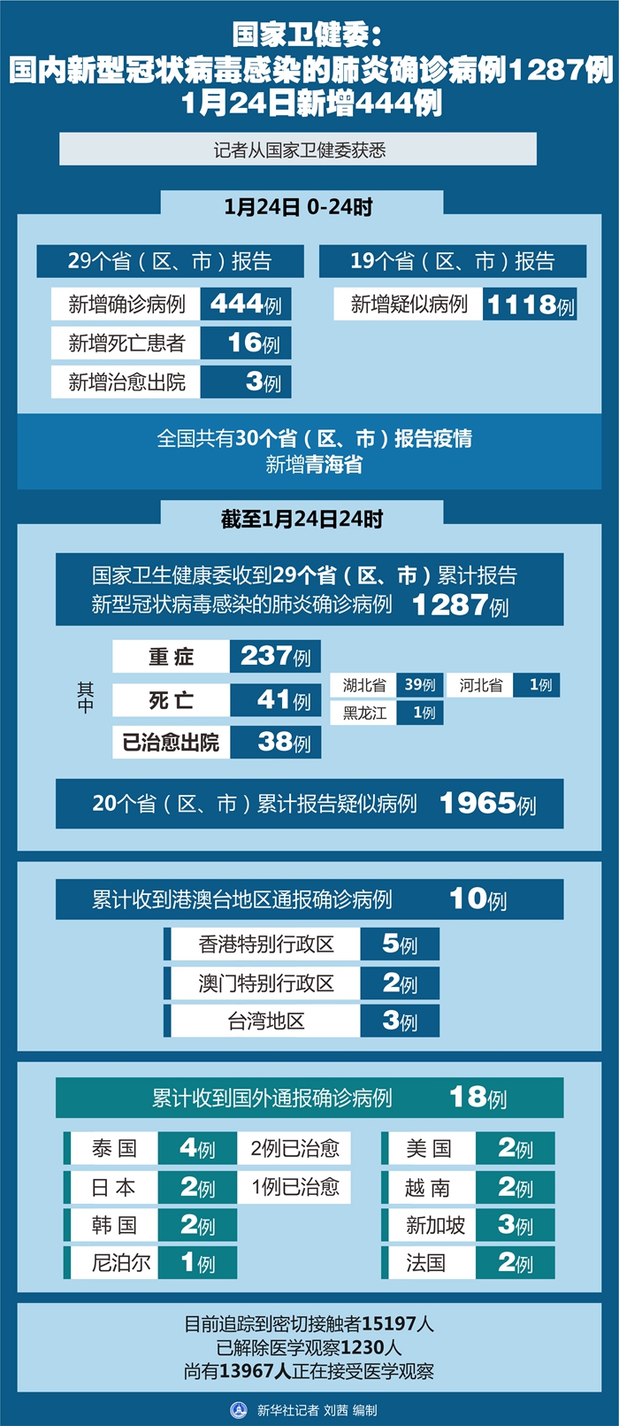 截至1月24日24時,國家衛健委收到29個?。▍^、市)累計報告新型冠狀病毒感染的肺炎確診病例1287例,其中重癥237例,死亡41例(湖北省39例、河北省1例、黑龍江1例)。已治愈出院38例。20個?。▍^、市)累計報告疑似病例1965例。
