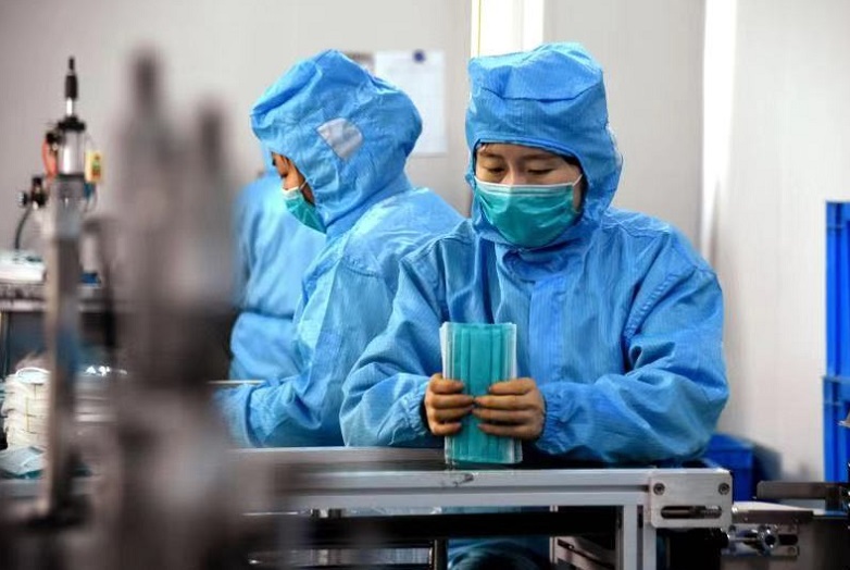 1月28日,工人在河北定州市一家口罩生產企業車間工作。連日來,河北省定州市口罩生產企業召回員工加班加點生產口罩,助力防控新型冠狀病毒感染的肺炎疫情。