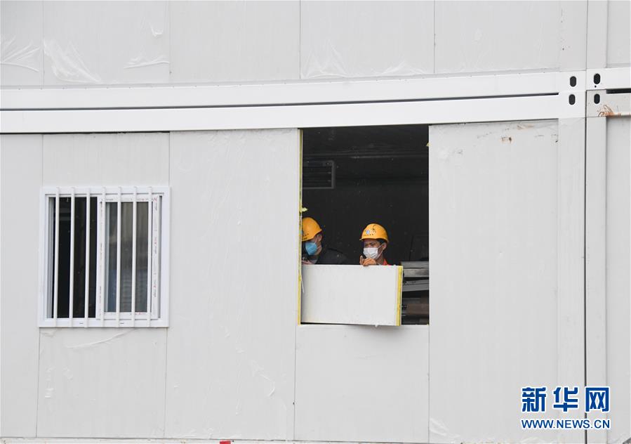2月2日,工人在已經基本建設成形的醫院病房工作。 新華社記者 程敏 攝