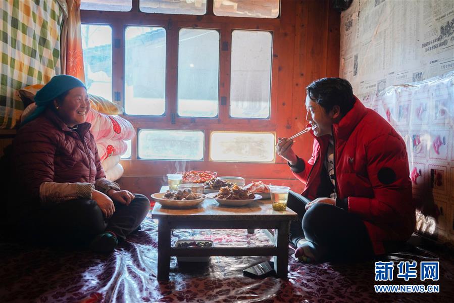 外出打工回來的馬明軍(右)在品嘗母親包玉娥(左)做的新年美食(1月26日攝)。新華社發(郎兵兵攝)