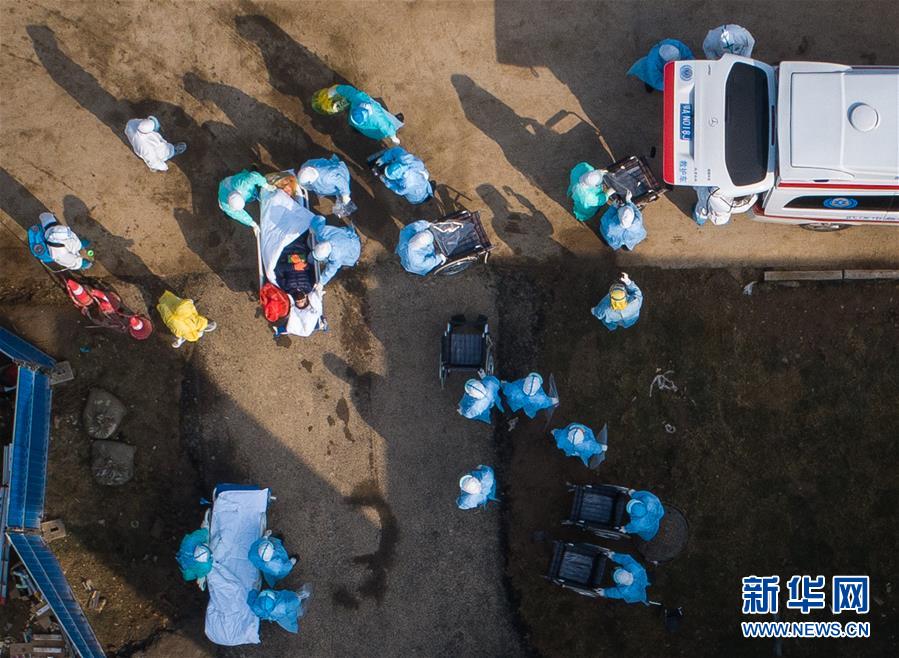 2月4日,醫護人員將新型冠狀病毒感染的肺炎確診患者送入武漢火神山醫院病房(無人機照片)。新華社記者 肖藝九 攝