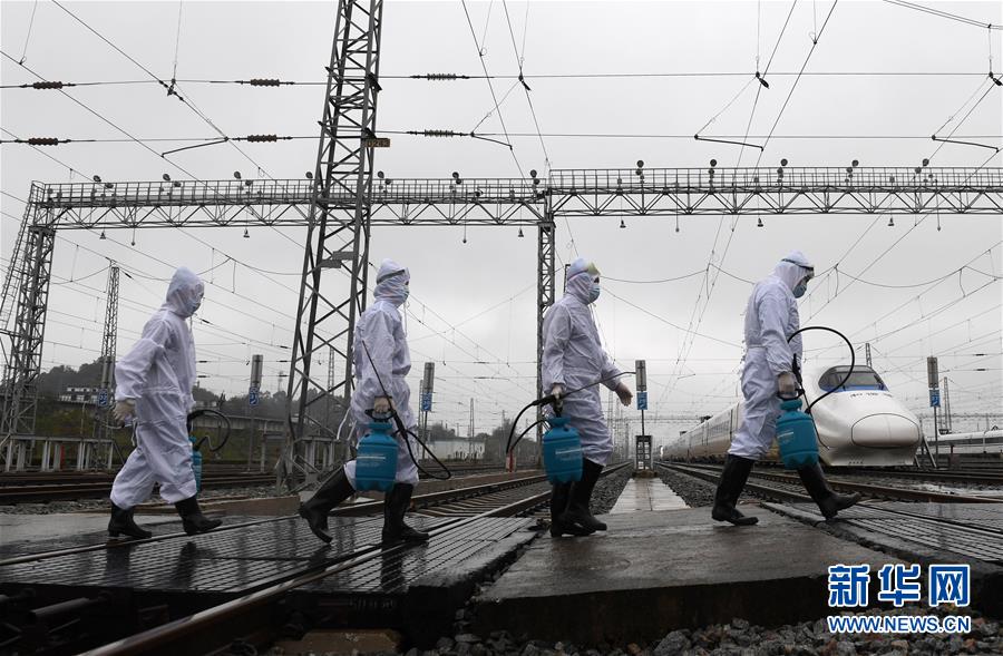 中國鐵路南寧局集團有限公司疾控中心工作人員走進工作區域準備對動車實施消殺作業(2月6日攝)。 新華社記者陸波岸攝