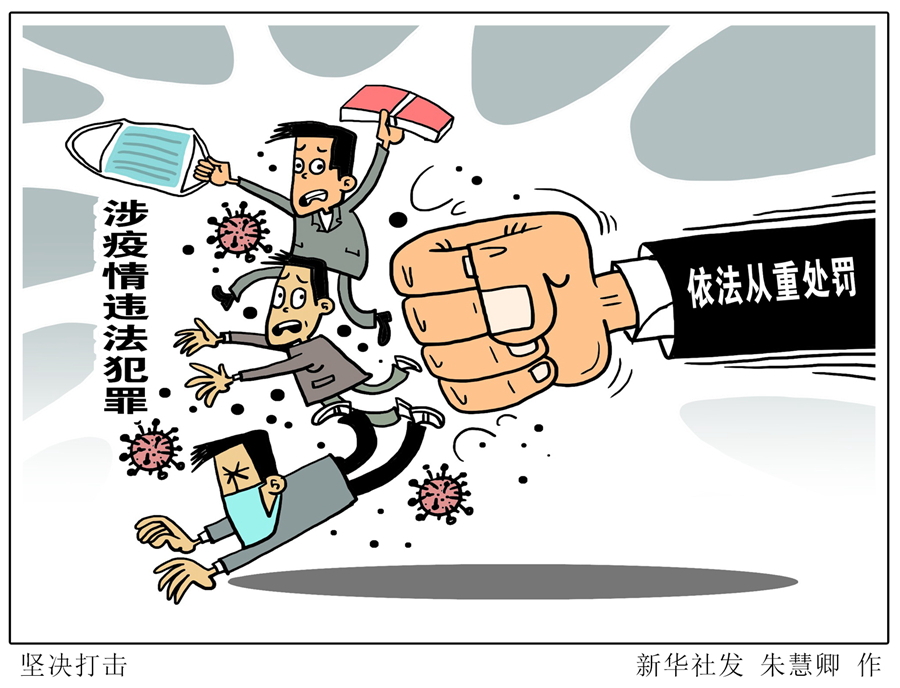 執法司法的鐵面莊嚴,彰顯庇佑民生的溫情。在疫情防控期間實施有關違法犯罪的,政法機關作為從重情節予以考量,依法體現從嚴的政策要求。 疫情發生以來,全國公安機關查處擾亂社會秩序類案件377起,干擾疫情防控類案件83起,妨害公務類案件55起;破獲非法獵捕珍貴野生動物、非法狩獵等刑事案件19起,抓獲犯罪嫌疑人29名;破獲涉疫情詐騙案件1116起,抓獲犯罪嫌疑人294名,追繳贓款660余萬元…… 新華社發 朱慧卿 作