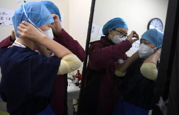 武漢協和醫院(西院),湘雅醫院感染病科醫生在穿防護衣。經濟日報記者高興貴攝