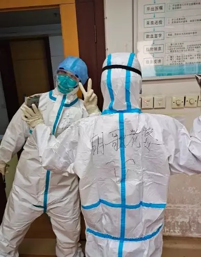 在防護服上寫下了“武漢加油”