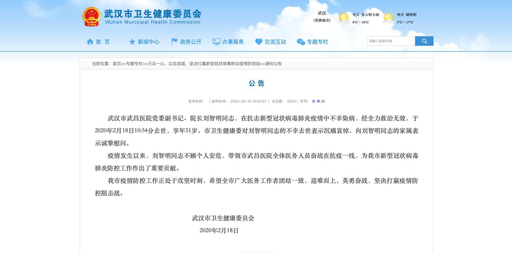 2月18日中午,武漢市衛健委發布公告,武漢市武昌醫院黨委副書記、院長劉智明同志,在抗擊新型冠狀病毒肺炎疫情中不幸染病,經全力救治無效,于2020年2月18日10:54分去世,享年51歲。