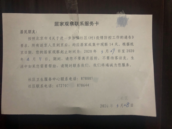 8、交接:車輛到達社區后,隨行的街道干部同社區工作人員進行交接。返京人員在測量體溫、簽署《居家觀察個人告知書》等文件后,由社區工作人員送至家中。居家觀察的14天內,將嚴格禁止外出、會客等行為,由社區安排專人幫助解決生活困難。