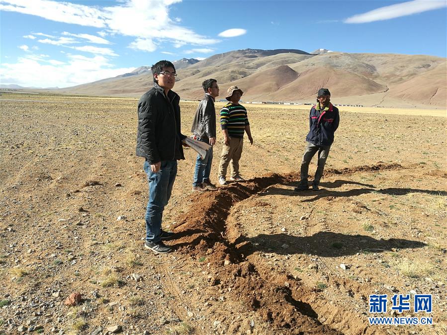 科考隊員王向濤(左一)在藏北高原考察高寒草地退化狀況(2018年6月13日攝)。新華社發