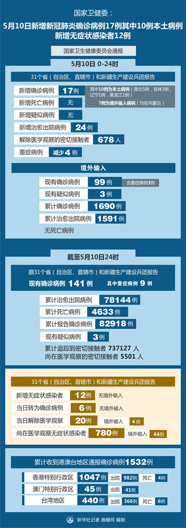 新華社北京5月11日電(記者屈婷)國家衛生健康委員會11日通報,5月10日0-24時,31個?。ㄗ灾螀^、直轄市)和新疆生產建設兵團報告新增新冠肺炎確診病例17例,其中10例為本土病例(湖北5例,吉林3例,遼寧1例,黑龍江1例),7例為境外輸入病例(均在內蒙古);無新增死亡病例;無新增疑似病例。