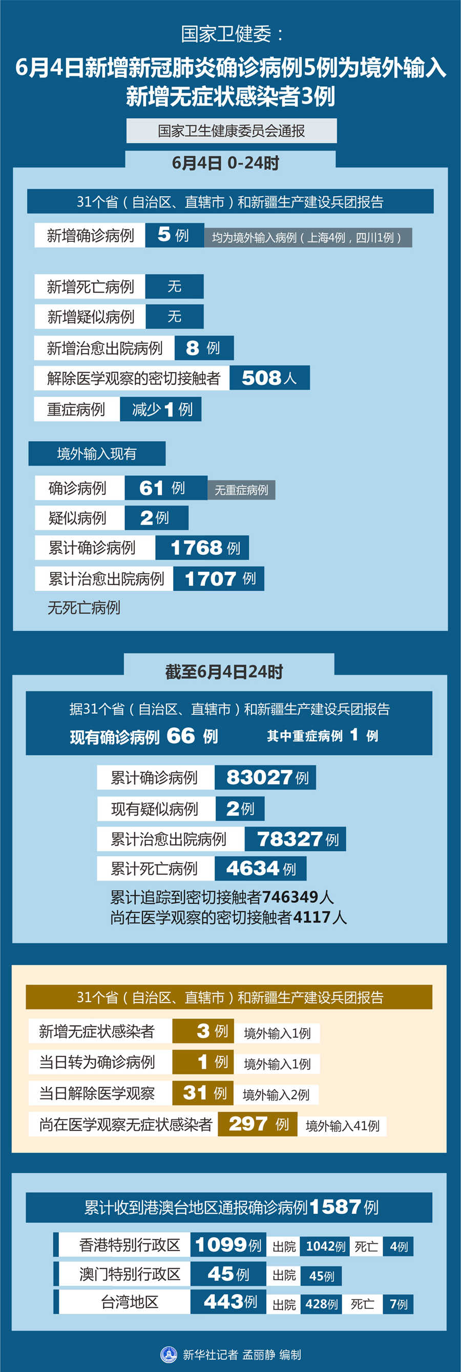 截至6月4日24時,據31個?。ㄗ灾螀^、直轄市)和新疆生產建設兵團報告,現有確診病例66例(其中重癥病例1例),累計治愈出院病例78327例,累計死亡病例4634例,累計報告確診病例83027例,現有疑似病例2例。累計追蹤到密切接觸者746349人,尚在醫學觀察的密切接觸者4117人。