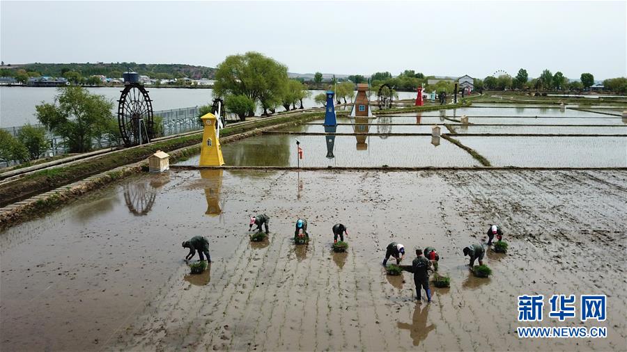 農民在黑龍江省寧安市渤海鎮上官地村的稻田中插秧(5月22日攝)。新華社記者 王建威 攝
