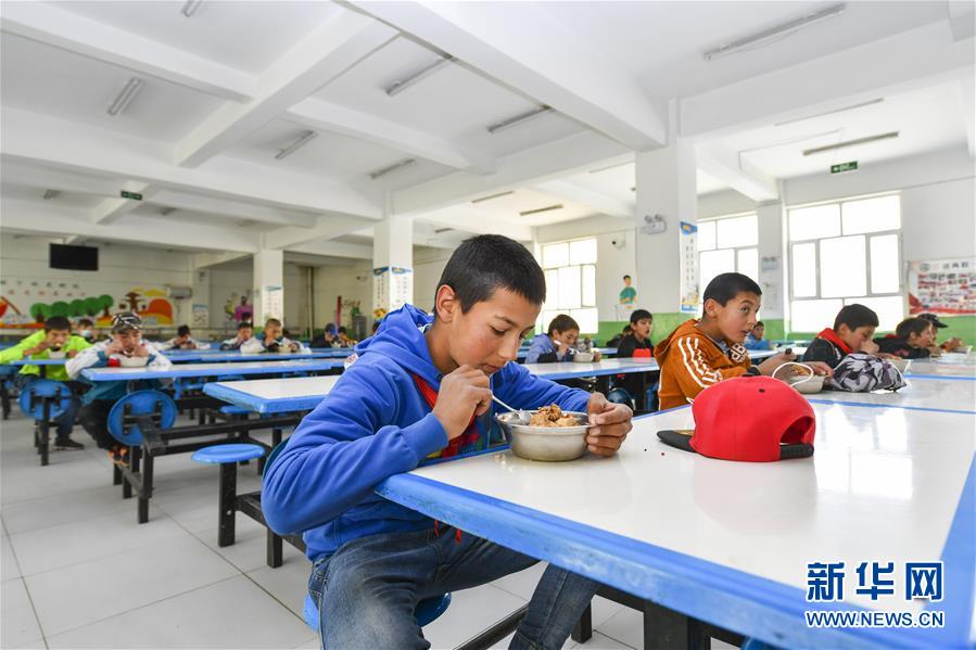 新疆塔什庫爾干塔吉克自治縣城鄉寄宿制小學學生在吃營養午餐(6月3日攝)。 新華社記者 胡虎虎 攝
