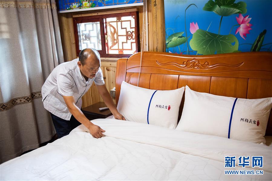 在湘西十八洞村,楊正邦在整理民宿(6月30日攝)。 新華社記者 陳思汗 攝